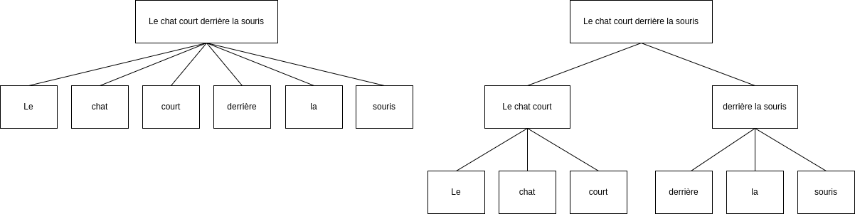 Mais on peut aussi introduire un niveau intermédiaire avec deux proto-structures, Le chat court (proposition principale) et derrière la souris (groupe prépositionnel), chacune composée de mots. Nous avons alors trois niveaux hiérarchiques.
